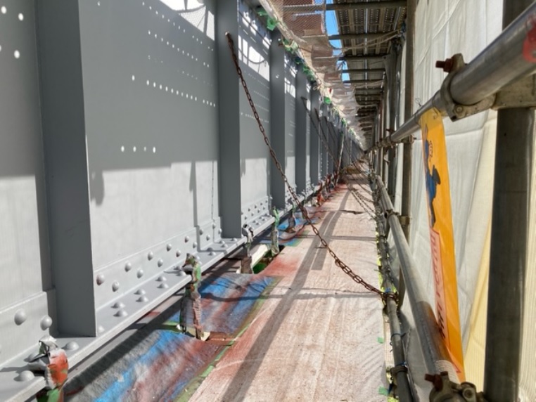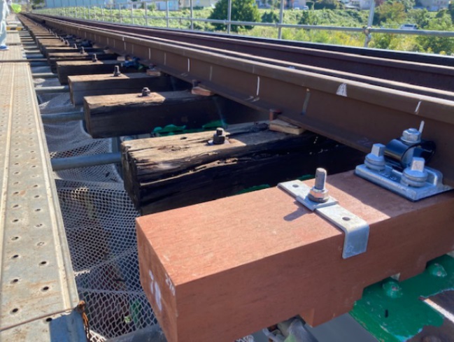 工事内容は、橋桁の塗装工事と、橋梁内のマクラギを木製から合成マクラギに交換しました。
