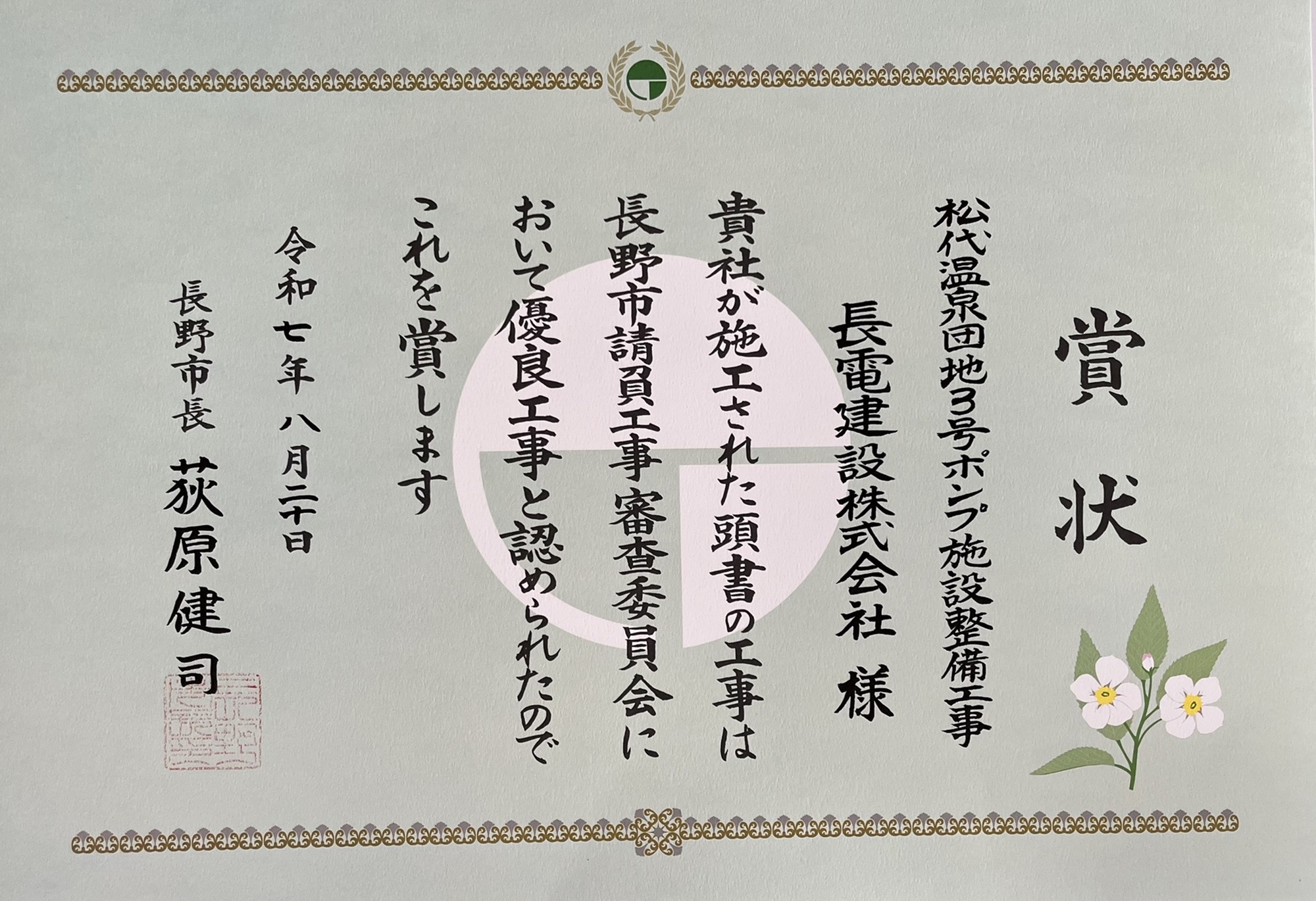 ンプ施設整備工事」が優秀な成績と評価され長野市より表彰されました。