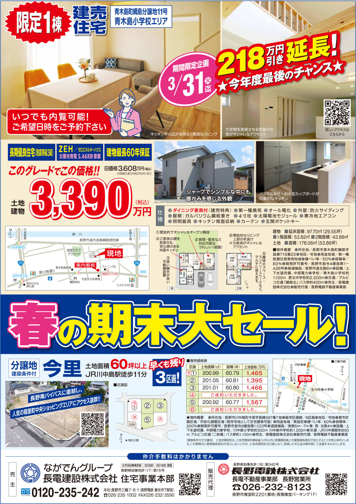 また、「青木島町綱島新築建売住宅」特別値引期間も、3月31日まで延長します。